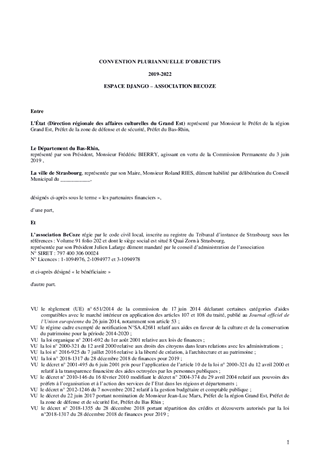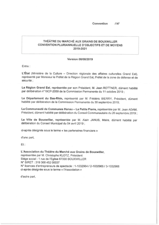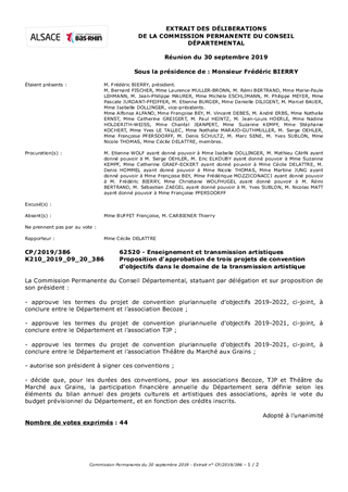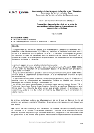 Le Département du Bas-Rhin a décidé, par délibération du Conseil Départemental du 13 décembre 2018 (délibération n°CD/2018/115), d’adopter le schéma d’orientation pour la culture et le patrimoine pour la période 2018-2021. Ce schéma fixe l’objectif de garantir des services culturels de proximité dans le domaine de la création artistique, de la diffusion artistique, de la pratique artistique amateur, de l'enseignement artistique et de l'éducation artistique et culturelle. Le présent rapport propose à la Commission Permanente : • d’approuver les termes du projet de convention pluriannuelle d’objectifs 2019-2022 à conclure entre le Département et l’association Becoze et d’autoriser son président à signer cette convention ; • d’approuver les termes du projet de convention pluriannuelle d’objectifs 2019-2021 à conclure entre le Département et l’association TJP et d’autoriser son président à signer cette convention ; • d’approuver les termes du projet de convention pluriannuelle d’objectifs 2019-2021 à conclure entre le Département et l’association Théâtre du Marché aux Grains et d’autoriser son président à signer cette convention ; • de décider que, pour les durées des conventions, pour les associations Becoze, TJP et Théâtre du Marché aux Grains, la participation financière annuelle du Département sera définie selon les éléments du bilan annuel des projets culturels et artistiques des associations, après le vote du budget prévisionnel du Département, et en fonction des crédits inscrits.