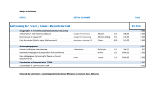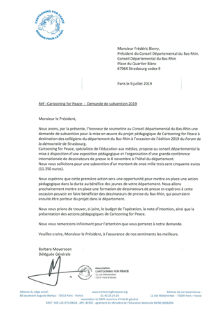 Proposition d'actions dans le cadre du Forum Mondial de la Démocratie 2019, dont l'organisation d'une conférence internationale de dessinateurs de presse à destination des collégiens bas-rhinois en partenariat avec l'association Cartooning for Peace, ainsi que des sessions découverte du Conseil de l'Europe pour les collégiens.