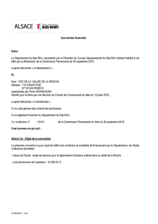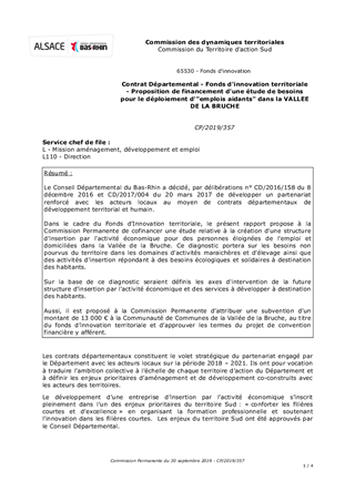 Le Conseil Départemental du Bas-Rhin a décidé, par délibérations n° CD/2016/158 du 8 décembre 2016 et CD/2017/004 du 20 mars 2017 de développer un partenariat renforcé avec les acteurs locaux au moyen de contrats départementaux de développement territorial et humain. Dans le cadre du Fonds d'Innovation territoriale, le présent rapport propose à la Commission Permanente de cofinancer une étude relative à la création d'une structure d'insertion par l'activité économique pour des personnes éloignées de l'emploi et domiciliées dans la Vallée de la Bruche. Ce diagnostic portera sur les besoins non pourvus du territoire dans les domaines d'activités maraichères et d'élevage ainsi que des activités d'insertion répondant à des besoins écologiques et solidaires à destination des habitants. Sur la base de ce diagnostic seraient définis les axes d'intervention de la future structure d'insertion par l'activité économique et des services à développer à destination des habitants. Aussi, il est proposé à la Commission Permanente d’attribuer une subvention d’un montant de 13 000 € à la Communauté de Communes de la Vallée de la Bruche, au titre du fonds d’innovation territoriale et d’approuver les termes du projet de convention financière y afférent.