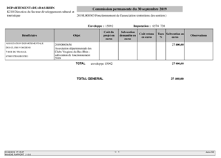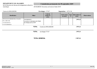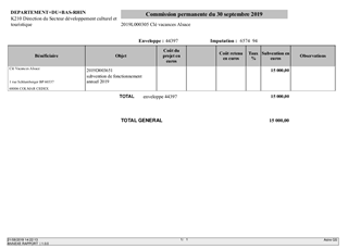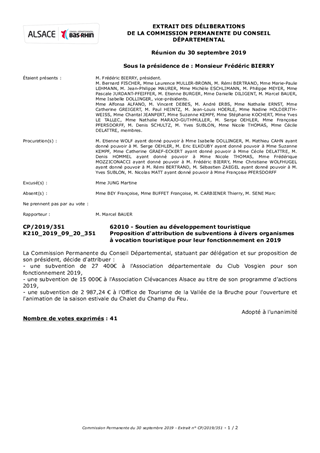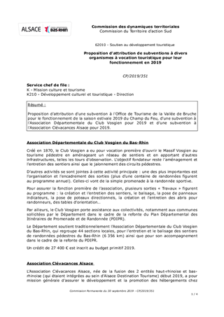 Proposition d'attribution d'une subvention à l'Office de Tourisme de la Vallée de Bruche pour le fonctionnement de la saison estivale 2019 du Champ du Feu, d'une subvention à l'Association Départementale du Club Vosgien pour 2019 et d'une subvention à l'Association Clévacances Alsace pour 2019.