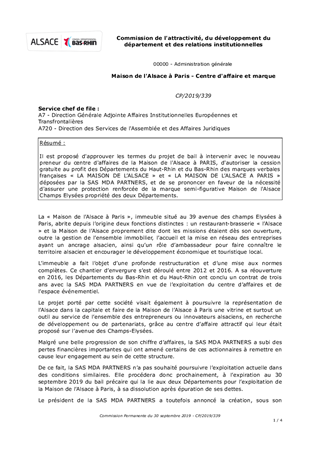 Il est proposé d'approuver les termes du projet de bail à intervenir avec le nouveau preneur du centre d'affaires de la Maison de l'Alsace à PARIS, d'autoriser la cession gratuite au profit des Départements du Haut-Rhin et du Bas-Rhin des marques verbales françaises « LA MAISON DE L’ALSACE » et « LA MAISON DE L’ALSACE A PARIS » déposées par la SAS MDA PARTNERS, et de se prononcer en faveur de la nécessité d'assurer une protection renforcée de la marque semi-figurative Maison de l'Alsace Champs Elysées propriété des deux Départements.