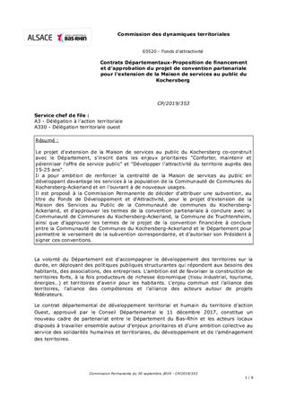 Le projet d'extension de la Maison de services au public du Kochersberg co-construit avec le Département, s'inscrit dans les enjeux prioritaires "Conforter, maintenir et pérenniser l’offre de service public" et "Développer l’attractivité du territoire auprès des 15-25 ans". Il a pour ambition de renforcer la centralité de la Maison de services au public en développant davantage les services à la population de la Communauté de Communes du Kochersberg-Ackerland et en l’ouvrant à de nouveaux usages. Il est proposé à la Commission Permanente de décider d'attribuer une subvention, au titre du Fonds de Développement et d'Attractivité, pour le projet d'extension de la Maison des Services au Public de la Communauté de communes du Kochersberg-Ackerland, et d'approuver les termes de la convention partenariale à conclure avec la Communauté de Communes du Kochersberg-Ackerland, la Commune de Truchtersheim, ainsi que d’approuver les termes de le projet de la convention financière à conclure entre la Communauté de Communes du Kochersberg-Ackerland et le Département pour permettre le versement de la subvention correspondante, et d'autoriser son Président à signer ces conventions.