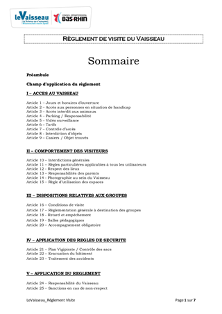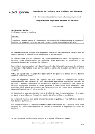 Le présent rapport soumet à l'approbation de l'Assemblée Départementale le règlement de visite du Vaisseau. Il met en place un certain nombre de mesures de sécurité.