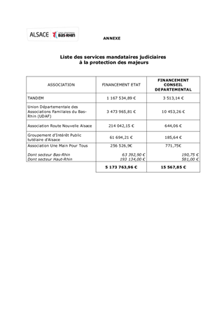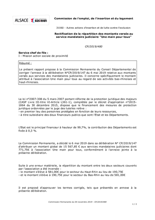 Le présent rapport propose à la Commission Permanente du Conseil Départemental de corriger l'annexe à la délibération N°CP/2019/147 du 6 mai 2019 relative aux montants versés aux services des mandataires judiciaires. Il concerne spécifiquement le montant attribué à l'association Une main pour tous au regard de ses activités bas-rhinoises et haut-rhinoises.