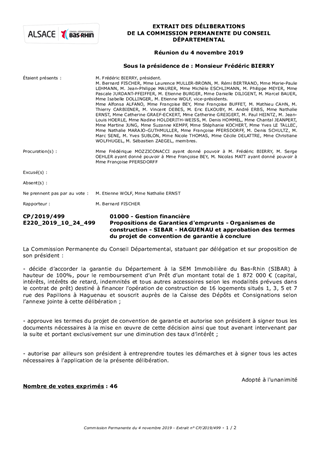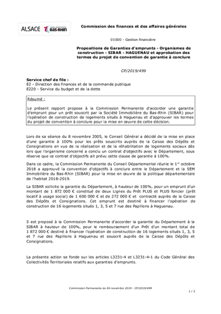 Le présent rapport propose à la Commission Permanente d’accorder une garantie d’emprunt pour un prêt souscrit par la Société Immobilière du Bas-Rhin (SIBAR) pour l’opération de construction de logements situés à Haguenau et d’approuver les termes du projet de convention à conclure pour la mise en œuvre de cette décision.