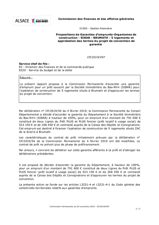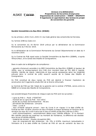 Le présent rapport propose à la Commission Permanente d’accorder une garantie d’emprunt pour un prêt souscrit par la Société Immobilière du Bas-Rhin (SIBAR) pour l’opération de construction de 5 logements situés à Brumath et d’approuver les termes du projet de convention.