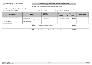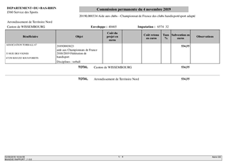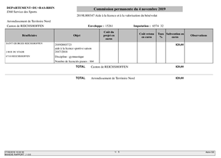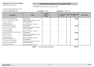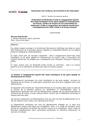Le présent rapport propose à la Commission Permanente d'attribuer des aides en vertu des dispositions de la politique sportive adoptée en Assemblée Plénière du 22 octobre 2018 (cf. délibération N°CD/2018/044). Il s'agit, d'une part, de nouveaux dispositifs : aide à l'engagement sportif des clubs handisport et de sport adapté en Championnat de France, aide à l'acquisition de matériel sportif par les collèges pour l'enseignement de l'Education Physique et Sportive (EPS). Il s'agit, d'autre part, de dispositifs d'aide révisés ou confirmés : aide à la licence sportive et à la valorisation du bénévolat, aide à la licence scolaire.