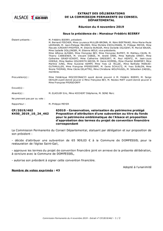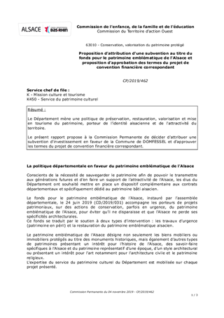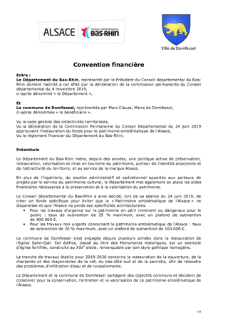 Le Département mène une politique de préservation, restauration, valorisation et mise en tourisme du patrimoine, porteur de l'identité alsacienne et de l'attractivité du territoire. Le présent rapport propose à la Commission Permanente de décider d'attribuer une subvention d'investissement en faveur de la Commune de DOMFESSEL et d'approuver les termes du projet de convention financière correspondant.
