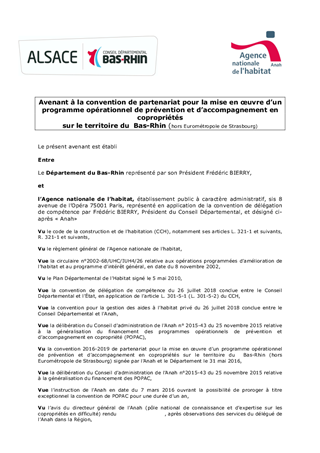 Le présent rapport propose à la commission permanente de décider de la poursuite des actions mises en œuvre pour l'accompagnement des copropriétés fragiles dans le cadre de son Programme Opérationnel de Prévention et d'Accompagnement en Copropriété (POPAC 67), hors Eurométropole de STRASBOURG. A ce titre, il fait l’objet d’une convention de partenariat et d’un co-financement entre l’Anah et le Département, pour la période du 1er décembre 2016 au 30 novembre 2019. Il s'agit de proposer la signature d'un avenant en vue de la prorogation du programme pour une année.
