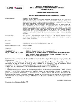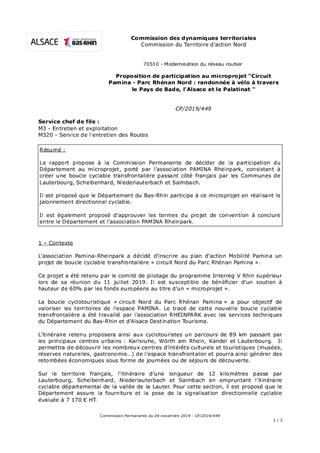 Le rapport propose à la Commission Permanente de décider de la participation du Département au microprojet, porté par l’association PAMINA Rheinpark, consistant à créer une boucle cyclable transfrontalière passant côté français par les Communes de Lauterbourg, Scheibenhard, Niederlauterbach et Salmbach. Il est proposé que le Département du Bas-Rhin participe à ce microprojet en réalisant le jalonnement directionnel cyclable. Il est également proposé d'approuver les termes du projet de convention à conclure entre le Département et l’association PAMINA Rheinpark.