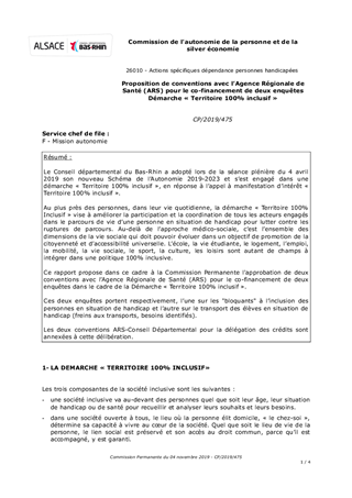Le Conseil départemental du Bas-Rhin a adopté lors de la séance plénière du 4 avril 2019 son nouveau Schéma de l’Autonomie 2019-2023 et s’est engagé dans une démarche « Territoire 100% inclusif », en réponse à l’appel à manifestation d’intérêt « Territoire 100% inclusif ». Au plus près des personnes, dans leur vie quotidienne, la démarche « Territoire 100% Inclusif » vise à améliorer la participation et la coordination de tous les acteurs engagés dans le parcours de vie d’une personne en situation de handicap pour lutter contre les ruptures de parcours. Au-delà de l’approche médico-sociale, c’est l’ensemble des dimensions de la vie sociale qui doit pouvoir évoluer dans un objectif de promotion de la citoyenneté et d’accessibilité universelle. L’école, la vie étudiante, le logement, l’emploi, la mobilité, la vie sociale, le sport, la culture, les loisirs sont autant de champs à intégrer dans une politique 100% inclusive. Ce rapport propose dans ce cadre à la Commission Permanente l'approbation de deux conventions avec l’Agence Régionale de Santé (ARS) pour le co-financement de deux enquêtes dans le cadre de la Démarche « Territoire 100% inclusif ». Ces deux enquêtes portent respectivement, l’une sur les "bloquants" à l’inclusion des personnes en situation de handicap et l’autre sur le transport des élèves en situation de handicap (freins aux transports, besoins identifiés). Les deux conventions ARS-Conseil Départemental pour la délégation des crédits sont annexées à cette délibération.