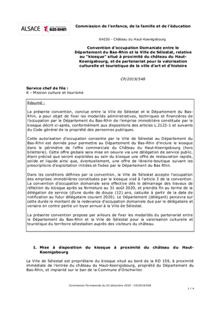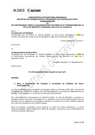 La présente convention, conclue entre la Ville de Sélestat et le Département du Bas-Rhin, a pour objet de fixer les modalités administratives, techniques et financières de l’occupation par le Département du Bas-Rhin de l’emprise immobilière constituée par le kiosque décrit ci-après, conformément aux dispositions des articles L.2122-1 et suivants du Code général de la propriété des personnes publiques. Cette autorisation d’occupation consentie par la Ville de Sélestat au Département du Bas-Rhin est donnée pour permettre au Département du Bas-Rhin d’inclure le kiosque dans le périmètre de l’offre commerciale du Château du Haut-Koenigsbourg (hors billetterie). Cette offre globale sera mise en oeuvre via une délégation de service public, étant précisé que seront exploitées au sein du kiosque une offre de restauration rapide, solide et liquide ainsi que, éventuellement, une offre de librairie-boutique suivant les prescriptions d’exploitation initiées et fixées par le Département du Bas Rhin. Dans les conditions définies par la convention, la Ville de Sélestat accepte l’occupation des emprises immobilières constituées par le kiosque visé à l'article 2 de la convention. La convention d'occupation domaniale sera effective dès le démarrage des travaux de réfection du kiosque après sa fermeture au 31 août 2020, et prendra fin au terme de la délégation de service (d'une durée de douze (12) ans, calculée à partir de la date de notification au futur délégataire courant 2020). Le Département (délégant) percevra sur cette durée le montant de la redevance d'occupation domaniale due par le délégataire et versera en contre partie un loyer annuel à la Ville de Sélestat. La présente convention propose par ailleurs de fixer les modalités du partenariat entre le Département du Bas-Rhin et la Ville de Sélestat pour la valorisation culturelle et touristique du territoire sélestadien auprès des visiteurs du château.
