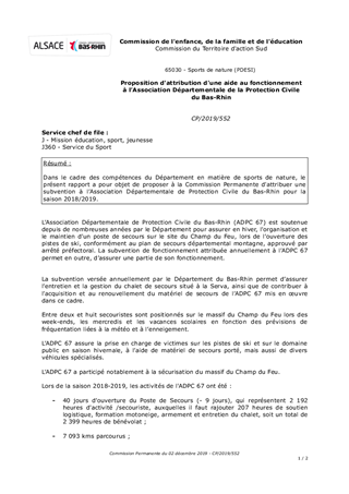 Dans le cadre des compétences du Département en matière de sports de nature, le présent rapport a pour objet de proposer à la Commission Permanente d'attribuer une subvention à l’Association Départementale de Protection Civile du Bas-Rhin pour la saison 2018/2019.