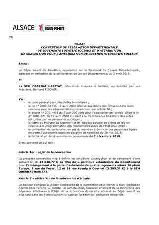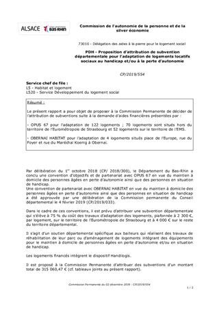 Le présent rapport a pour objet de proposer à la Commission Permanente de décider de l’attribution de subventions suite à la demande d’aides financières présentées par : - OPUS 67 pour l’adaptation de 122 logements ; 70 logements sont situés hors du territoire de l’Eurométropole de Strasbourg et 52 logements sur le territoire de l’EMS. - OBERNAI HABITAT pour l’adaptation de 4 logements situés place de l’Europe, rue du Foyer et rue du Maréchal Koenig à Obernai.
