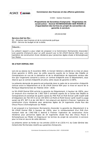 Le présent rapport a pour objet de proposer à la Commission Permanente d’accorder une garantie d’emprunt pour un prêt souscrit par la SA d’HLM Domial ESH pour une opération de construction d’une résidence pour personnes âgées située à Schweighouse sur Moder.