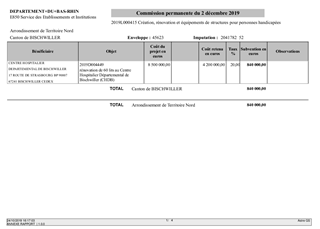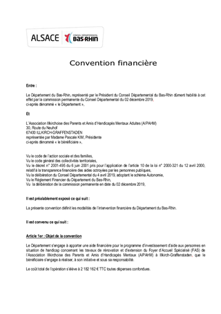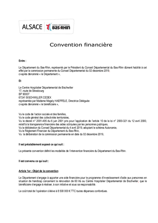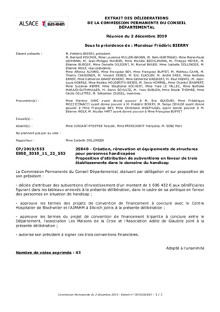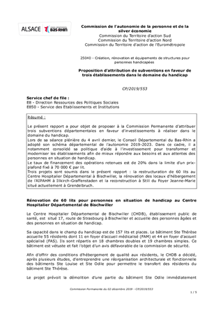 Le présent rapport a pour objet de proposer à la Commission Permanente d'attribuer trois subventions départementales en faveur d'investissements à réaliser dans le domaine du handicap. Lors de sa séance plénière du 4 avril dernier, le Conseil Départemental du Bas-Rhin a adopté son schéma départemental de l'autonomie 2019-2023. Dans ce cadre, il a notamment consolidé sa politique d'aide à l'investissement pour transformer et moderniser les établissements afin de mieux répondre aux besoins et aux attentes des personnes en situation de handicap. Le taux de financement des opérations retenues est de 20% dans la limite d'un prix-plafond fixé à 70 000 € par lit. Trois projets sont soumis dans le présent rapport : la restructuration de 60 lits au Centre Hospitalier Départemental à Bischwiller, la rénovation des locaux d'hébergement de l'AIPAHM à Illkirch-Graffenstaden et la reconstruction à Still du Foyer Jeanne-Marie situé actuellement à Grendelbruch.