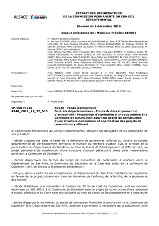 Le Département du Bas-Rhin a décidé, par délibération du Conseil Départemental n°CD/2016/157 du 8 décembre 2016 et n°CD/2017/004 du 20 mars 2017, de développer un partenariat renforcé avec les acteurs locaux en mettant en œuvre les contrats départementaux de développement territorial et humain. Ces contrats constituent le volet stratégique de partenariat engagé par le Département avec les acteurs locaux sur la période 2018-2021. Ils ont pour vocation de traduire une ambition collective à l'échelle de chaque territoire d'action du Département et de définir les enjeux prioritaires d'aménagement et de développement, co-construits avec le acteurs du territoire. Dans ce cadre, le Conseil Départemental a approuvé les termes du contrat départemental de développement territorial et humain du territoire d'action Sud, le 11 décembre 2017 (délibération n°CD/2017/077). Le projet de construction d'une structure d'accueil périscolaire et d'une salle mutualisable de la Commune de Dachstein, co-construit avec le Département et le Club des Aînés de la commune, s'inscrit dans les enjeux prioritaires : "conforter maintenir et pérenniser l'offre de services au public" et "adapter le territoire à l'avancée en âge". Dans ce cadre, il est proposé à la Commission Permanente d'attribuer une subvention d'un montant total de 283 400 €, au titre du Fonds d'attractivité et de développement, et d'approuver les termes du projet de convention partenariale et de convention financière à conclure en vue de la réalisation de ces travaux.