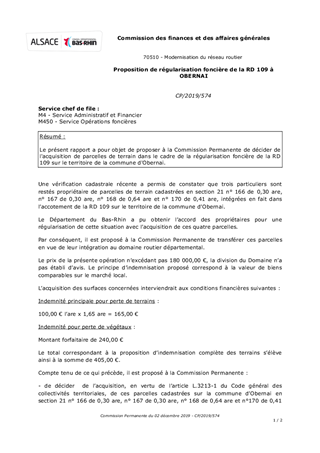Le présent rapport a pour objet de proposer à la Commission Permanente de décider de l'acquisition de parcelles de terrain dans le cadre de la régularisation foncière de la RD 109 sur le territoire de la commune d'Obernai.