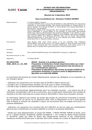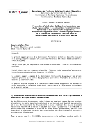 Le présent rapport propose à la Commission Permanente d'attribuer des aides relevant de la politique sportive adoptée en Assemblée Plénière du 22 octobre 2018 (délibération n°CD/2018/044). Il s'agit d'une part, de dispositifs d'aide révisés ou confirmés : l'aide aux manifestations sportives. Il s'agit d'autre part, de nouveaux dispositifs : l'aide aux clubs "passerelles" évoluant au 2ème niveau professionnel pour la saison 2019/2020. Le présent rapport propose à la Commission Permanente d'approuver les projets d'actions proposés et les termes des projets de conventions financières à conclure avec les clubs "passerelles" aidés. Le présent rapport propose à la Commission Permanente d'approuver les termes du projet modifié de la convention financière à conclure entre le Département du Bas-Rhin et la SAS SIG ARENA.