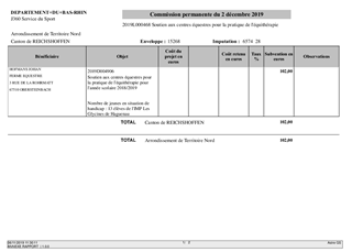 Le présent rapport propose à la Commission Permanente d'attribuer des aides en vertu des dispositions de la politique sportive adoptée en Assemblée Plénière du 22 octobre 2018 (cf. délibération n° CD/2018/044). Il s'agit d'une part de nouveaux dispositifs : aide à l'engagement sportif des clubs handisport et de sport adapté en Championnat de France, aide à l'acquisition de matériel sportif par les collèges pour l'enseignement de l'Education Physique et Sportive (EPS) et soutien aux sections sportives scolaires. Il s'agit d'autre part, de dispositifs d'aide révisés ou confirmés : aide aux déplacements dans le cadre de compétitions sportives scolaires et soutien aux centres équestres pour la pratique de l'équithérapie.