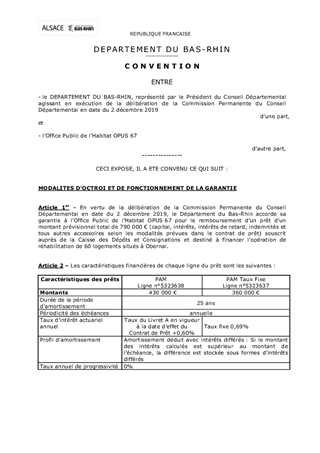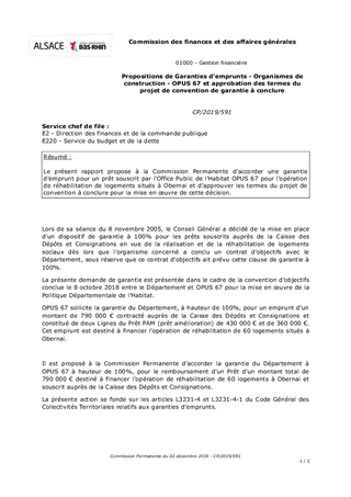 Le présent rapport propose à la Commission Permanente d’accorder une garantie d’emprunt pour un prêt souscrit par l’Office Public de l’Habitat OPUS 67 pour l’opération de réhabilitation de logements situés à Obernai et d’approuver les termes du projet de convention à conclure pour la mise en œuvre de cette décision.