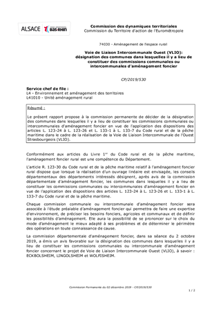 Le présent rapport propose à la commission permanente de décider de la désignation des communes dans lesquelles il y a lieu de constituer les commissions communales ou intercommunales d'aménagement foncier en vue de l'application des dispositions des articles L. 123-24 à L. 123-26 et L. 133-1 à L. 133-7 du Code rural et de la pêche maritime dans le cadre de la réalisation de la Voie de Liaison Intercommunale de l’Ouest Strasbourgeois (VLIO).