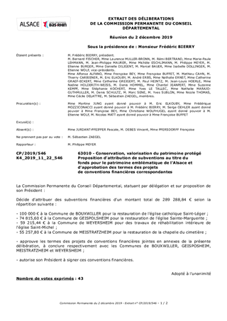 Le Département mène une politique de préservation, restauration, valorisation et mise en tourisme du patrimoine, porteur de l'identité alsacienne et de l'attractivité du territoire. Le présent rapport propose à la Commission Permanente d'attribuer des subventions d'investissement en faveur des Communes de BOUXWILLER, GEISPOLSHEIM, MEISTRATZHEIM et WEYERSHEIM et d'approuver les termes des projets de conventions financières correspondantes.