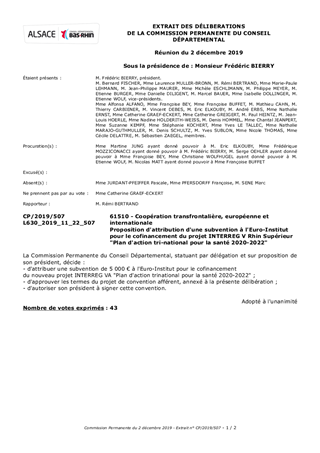 Proposition d'attribution d'une subvention à l'Euro-Institut pour le cofinancement du projet INTERREG V Rhin Supérieur "Plan d'action tri-national pour la santé 2020-2022"