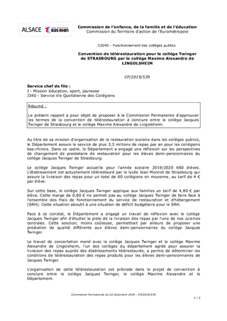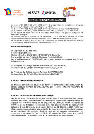 Le présent rapport a pour objet de proposer à la Commission Permanente d'approuver les termes de la convention de télérestauration à conclure entre le collège Jacques Twinger de Strasbourg et le collège Maxime Alexandre de Lingolsheim.