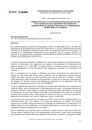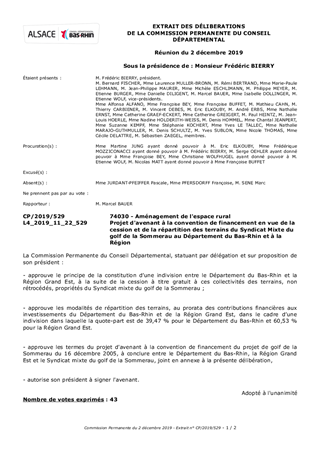Projet d’avenant à la convention de financement en vue de la cession et de la répartition des terrains du Syndicat Mixte du golf de la Sommerau au Département du Bas-Rhin et à la Région