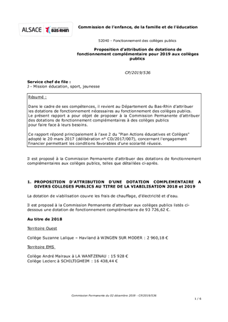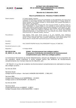 Dans le cadre de ses compétences, il revient au Département du Bas-Rhin d’attribuer les dotations de fonctionnement nécessaires au fonctionnement des collèges publics. Le présent rapport a pour objet de proposer à la Commission Permanente d'attribuer des dotations de fonctionnement complémentaires à des collèges publics pour faire face à leurs besoins. Ce rapport répond principalement à l'axe 2 du "Plan Actions éducatives et Collèges" adopté le 20 mars 2017 (délibération n° CD/2017/007), concernant l'engagement financier permettant les conditions favorables d'une scolarité réussie.