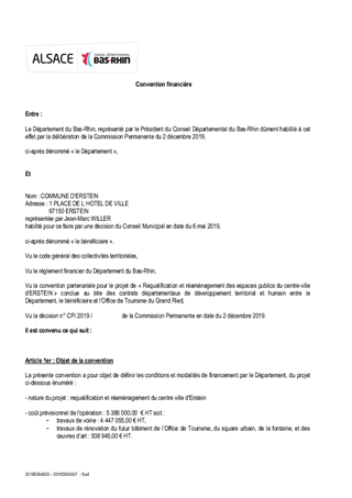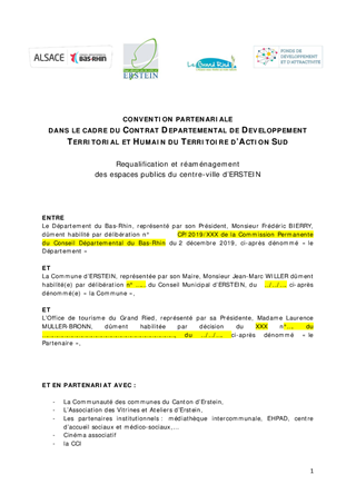 Le Département du Bas-Rhin a décidé, par délibération du Conseil Départemental n°CD/2016/157 du 8 décembre 2016 et n°CD/2017/004 du 20 mars 2017, de développer un partenariat renforcé avec les acteurs locaux en mettant en œuvre les contrats départementaux de développement territorial et humain. Ces contrats constituent le volet stratégique de partenariat engagé par le Département avec les acteurs locaux sur la période 2018-2021. Ils ont pour vocation de traduire une ambition collective à l'échelle de chaque territoire d'action du Département et de définir les enjeux prioritaires d'aménagement et de développement, co-construits avec les acteurs du territoire. Dans ce cadre, le Conseil Départemental a approuvé les termes du contrat départemental de développement territorial et humain du territoire d'action Sud, le 11 décembre 2017 (délibération n°CD/2017/077). Le projet de requalification et de réaménagement des espaces publics du centre-ville de la Commune d'Erstein, co-construit avec le Département du Bas-Rhin et l’Office du Tourisme du Grand Ried, s'inscrit dans l'enjeu prioritaire du territoire d'action Sud "conforter, maintenir et pérenniser l'offre de services au public : dynamiser l'offre commerciale dans les bourgs centre". Dans ce cadre, il est proposé à la Commission Permanente d'attribuer une subvention d'un montant total de 632 495 € à la Commune d'Erstein et d'approuver les termes du projet de convention partenariale et de convention financière à conclure en vue de la réalisation de ces travaux.