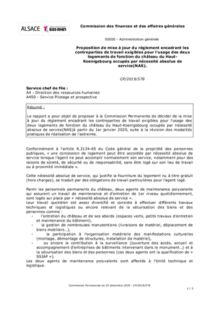 Le rapport a pour objet de proposer à la Commission Permanente de décider de la mise à jour du règlement encadrant les contreparties de travail exigibles pour l'usage des deux logements de fonction du château du Haut-Koenigsbourg occupés par nécessité absolue de service(NAS)à partir du 1er janvier 2020, suite à la révision des modalités pratiques de réalisation de l'astreinte.