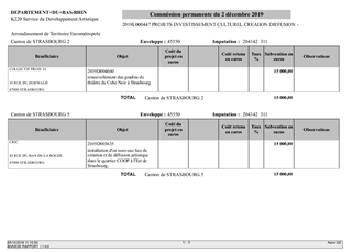 Le Département du Bas-Rhin a décidé, par délibération du Conseil Départemental du 13 décembre 2018, d’adopter le schéma d’orientation pour la culture et le patrimoine pour la période 2018-2021. Ce schéma fixe l’objectif de garantir des services culturels de proximité dans le domaine de la création artistique, de la diffusion artistique, de la pratique artistique en amateur, de l'enseignement artistique et de l'éducation artistique et culturelle. Dans ce cadre, le schéma prévoit de nouveaux modes d’intervention du Département du Bas-Rhin, notamment en investissement à travers la mise en œuvre de deux dispositifs dont un dispositif d’aide pour l’achat de petits matériels dédiés à l’équipement scénique, numérique et technique de structures culturelles et un dispositif d’aide à l’investissement en matière de dynamiques collectives pour les pratiques artistiques des usagers et pédagogiques pour les enseignants. Le présent rapport a pour objet de proposer à la Commission Permanente de décider d'attribuer des subventions à des projets d’investissement culturel aux associations Becoze, Trois 14, CRIC, BAAL Novo et à la Ville de Schiltigheim, pour un montant total de 51 145 €.