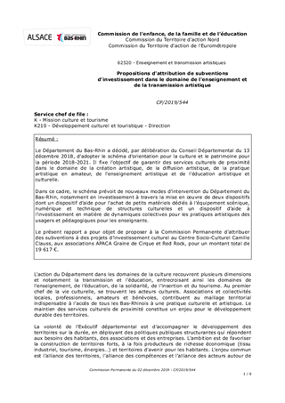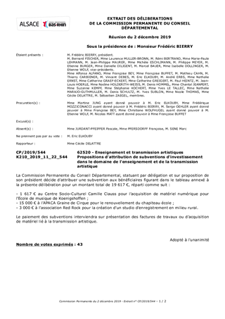 Le Département du Bas-Rhin a décidé, par délibération du Conseil Départemental du 13 décembre 2018, d’adopter le schéma d’orientation pour la culture et le patrimoine pour la période 2018-2021. Il fixe l’objectif de garantir des services culturels de proximité dans le domaine de la création artistique, de la diffusion artistique, de la pratique artistique en amateur, de l'enseignement artistique et de l'éducation artistique et culturelle. Dans ce cadre, le schéma prévoit de nouveaux modes d’intervention du Département du Bas-Rhin, notamment en investissement à travers la mise en œuvre de deux dispositifs dont un dispositif d’aide pour l’achat de petits matériels dédiés à l’équipement scénique, numérique et technique de structures culturelles et un dispositif d’aide à l’investissement en matière de dynamiques collectives pour les pratiques artistiques des usagers et pédagogiques pour les enseignants. Le présent rapport a pour objet de proposer à la Commission Permanente d'attribuer des subventions à des projets d’investissement culturel au Centre Socio-Culturel Camille Clauss, aux associations APACA Graine de Cirque et Red Rock, pour un montant total de 19 617 €.