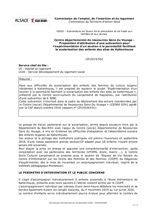 Face aux difficultés de scolarisation des enfants des familles de culture tsigane résidentes à Kaltenhouse, il est proposé de soutenir le projet "Expérimentation d’un soutien à la parentalité facilitant la scolarisation des enfants des sites de Kaltenhouse », présenté par le Centre socio-culturel du Langensand de Haguenau, par l'attribution d'une subvention de 6 500€. Cette subvention s'inscrirait dans le cadre du déploiement des actions coordonnées par le Centre (social) Départemental de Ressources Gens Du Voyage » (CEDRE GDV) agréé par la CAF depuis octobre 2018 (rapport n° CP/2018/431).
