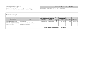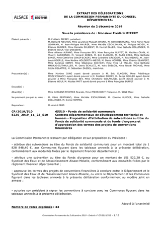 Résumé : Le présent rapport propose à la Commission Permanente d’attribuer dans le cadre des contrats départementaux des aides départementales aux Communes, au titre du Fonds de solidarité communale et d’attribuer une subvention au titre du Fonds d'urgence au Syndicat des Eaux et de l'Assainissement Alsace-Moselle et d'approuver les termes des projets de conventions financières annexées au présent rapport, pour un montant total de 1 980 370,68 €.