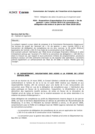 Le présent rapport a pour objet de proposer à la Commission Permanente d’approuver les termes du projet de l’avenant de « fin de gestion » pour l’année 2019 à la convention de délégation de compétence de six ans, conclue, le 26 juillet 2018,en application de l’article L.301-5-2 du Code de la construction et de l’habitation. Cet avenant prévoit l’attribution par l’Etat d’une enveloppe financière inférieure à celle initialement prévue par l'avenant n°1 2019 à la convention de délégation (- 169 264 €), dans la mesure où, par rapport à leurs prévisions initiales de programmation, plusieurs bailleurs sociaux ont été contraints d'annuler ou de reporter des opérations. L'avenant prévoit également un cofinancement de l'Etat de 29 000€ à l'action "MOUS gens du voyage".