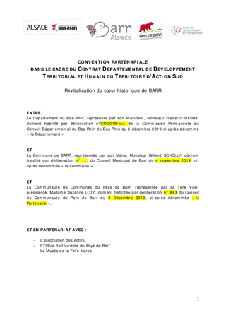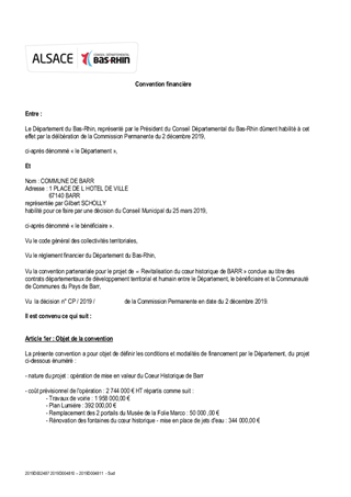 Le Département du Bas-Rhin a décidé, par délibération du Conseil Départemental n°CD/2016/157 du 8 décembre 2016 et n°CD/2017/004 du 20 mars 2017, de développer un partenariat renforcé avec les acteurs locaux en mettant en œuvre les contrats départementaux de développement territorial et humain. Ces contrats constituent le volet stratégique de partenariat engagé par le Département avec les acteurs locaux sur la période 2018-2021. Ils ont pour vocation de traduire une ambition collective à l'échelle de chaque territoire d'action du Département et de définir les enjeux prioritaires d'aménagement et de développement, co-construits avec les acteurs du territoire. Dans ce cadre, le Conseil Départemental a approuvé les termes du contrat départemental de développement territorial et humain du territoire d'action Sud, le 11 décembre 2017 (délibération n°CD/2017/077). Le projet de revitalisation du cœur historique de la Commune de Barr, co-construit avec le Département du Bas-Rhin et la Communauté de Communes du Pays de Barr, s'inscrit dans l'enjeu prioritaire du territoire d'action Sud "conforter, maintenir et pérenniser l'offre de services au public : dynamiser l'offre commerciale dans les bourgs centre". Dans ce cadre, il est proposé à la Commission Permanente d'attribuer une subvention d'un montant total de 284 200 € et d'approuver les termes du projet de convention partenariale et de convention financière à conclure en vue de la réalisation de ces travaux.