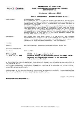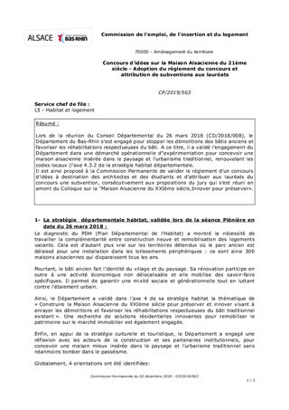 Lors de la réunion du Conseil Départemental du 26 mars 2018 (CD/2018/008), le Département du Bas-Rhin s’est engagé pour stopper les démolitions des bâtis anciens et favoriser les réhabilitations respectueuses du bâti. A ce titre, il a validé l’engagement du Département dans une démarché opérationnelle d’’expérimentation pour concevoir une maison alsacienne insérée dans le paysage et l’urbanisme traditionnel, renouvelant les codes locaux (l’axe 4.3.2 de la stratégie habitat départementale. Il est ainsi proposé à la Commission Permanente de valider le règlement d’un concours d’idées à destination des architectes et des étudiants et d’attribuer aux lauréats du concours une subvention, consécutivement aux propositions du jury qui s’est réuni en amont du Colloque sur la "Maison Alsacienne du XXIème siècle,Innover pour préserver».
