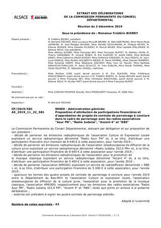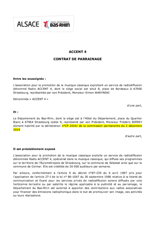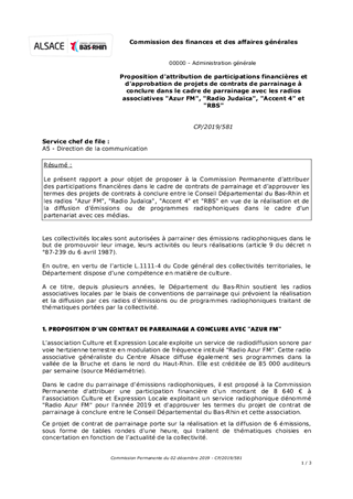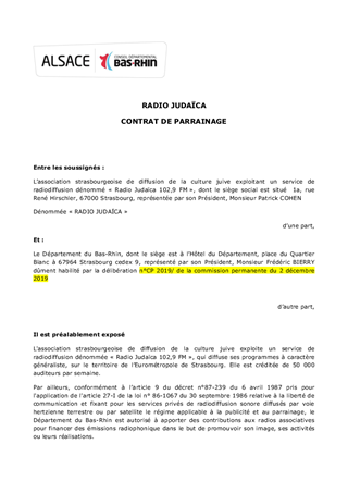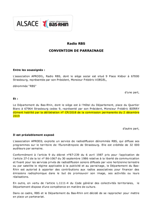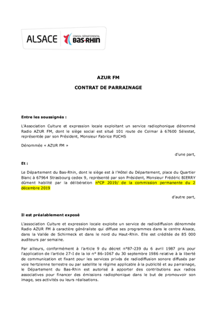 Le présent rapport a pour objet de proposer à la Commission Permanente d'attribuer des participations financières dans le cadre de contrats de parrainage et d'approuver les termes des projets de contrats à conclure entre le Conseil Départemental du Bas-Rhin et les radios "Azur FM", "Radio Judaïca", "Accent 4" et "RBS" en vue de la réalisation et de la diffusion d’émissions ou de programmes radiophoniques dans le cadre d’un partenariat avec ces médias.