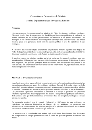 Dans la continuité du Schéma départemental d’accompagnement des parents, adopté en 2014, le Département du Bas-Rhin s’est engagé aux côtés de l’Etat, de la CAF du Bas-Rhin et de l’ensemble des partenaires, à poursuivre la collaboration engagée en faveur du développement des politiques de soutien à la parentalité et d’accueil de la petite enfance auprès de l’ensemble des familles bas-rhinoises. Face à l'accroissement des difficultés familiales et éducatives, il s'agit de consolider la prévention de l'émergence des ces difficultés, de renforcer l'offre d'accueil en proximité et l'accompagnement à la parentalité. Ce partenariat a conduit à l'élaboration d’un nouveau Schéma des services aux familles 2019-2023 et d’une convention de partenariat qu’il est proposé d’adopter, dans le respect des compétences et pouvoirs propres de chaque partenaire.