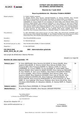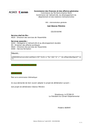 test Séance Plénière Resumé qdddddddwplvpwxdplvspldbpwlvllbf^blsrb<s^fss^dsb^lb^v*^sd;sdfqjizijfgiefjgoerf^ze^f Pièces jointes Délibération Rapport test Assemblée : Conseil Departemental Date : 07/08/2019 Rapporteur : Monsieur Rémi BERTRAND Collectivité : Conseil départemental du Bas-Rhin Direction : A6 - Secrétariat général Service : A620 - Direction des services de l'Assemblée Domaine : Non renseigné Commission : 1 - Commission des finances et des affaires générales