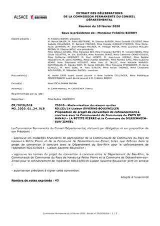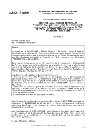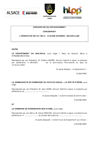 RD133/14 Liaison SAVERNE-BOUXWILLER Proposition de projet de convention de cofinancement à conclure avec la Communauté de Communes du PAYS DE HANAU - LA PETITE PIERRE et la Commune de DOSSENHEIM-SUR-ZINSEL
