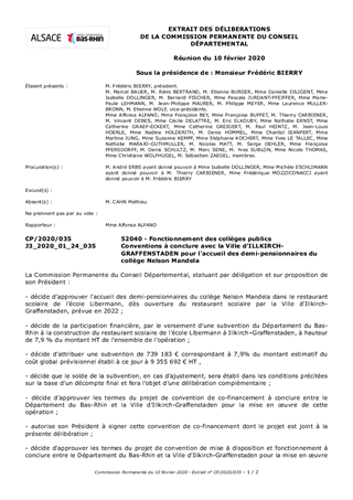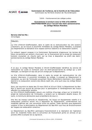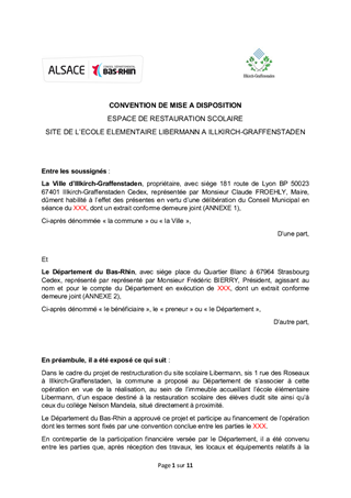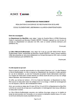La Ville d’Illkirch–Graffenstaden, dans le cadre de la restructuration du site scolaire Libermann, qui se trouve à proximité immédiate du collège Nelson Mandela, a proposé au Département la réalisation d’un espace commun destiné à la restauration scolaire. Le présent rapport propose à la Commission Permanente d’approuver les termes de deux conventions qui portent, d'une part, sur le financement de ce projet de restaurant scolaire mutualisé, et, d'autre part, sur sa mise à disposition au profit des demi-pensionnaires du collège Nelson Mandela.