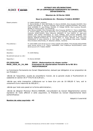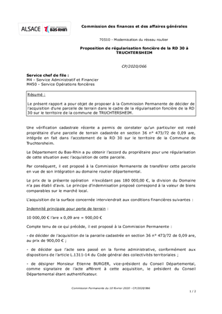 Le présent rapport a pour objet de proposer à la Commission Permanente de décider de l'acquisition d'une parcelle de terrain dans le cadre de la régularisation foncière de la RD 30 sur le territoire de la commune de TRUCHTERSHEIM.