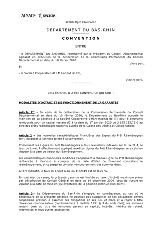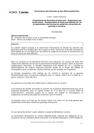 Le présent rapport propose à la Commission Permanente de décider du maintien de garanties suite à la renégociation de 8 Lignes du Prêt, menée par la Société Coopérative HLM Habitat de l’Ill et d’approuver les termes du projet de convention à conclure pour la mise en œuvre de cette décision.