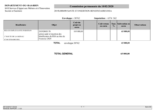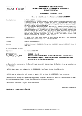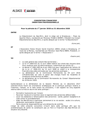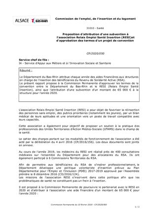 Le Département du Bas-Rhin attribue chaque année des aides financières aux structures en charge de l'insertion des bénéficiaires du Revenu de Solidarité Active (RSA). Le présent rapport propose à la Commission Permanente d’approuver les termes de la convention entre le Département du Bas-Rhin et le RESI (Relais Emploi Santé Insertion), ainsi que l’attribution d’une subvention d’un montant de 65 000 € à la structure pour l’année 2020.