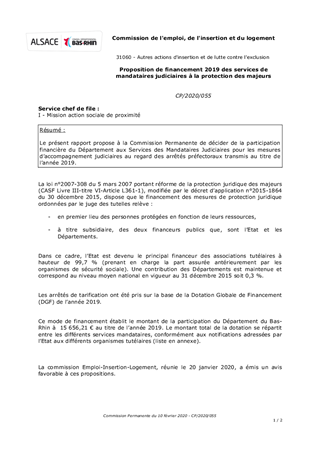 Le présent rapport propose à la Commission Permanente de décider de la participation financière du Département aux Services des Mandataires Judiciaires pour les mesures d’accompagnement judiciaires au regard des arrêtés préfectoraux transmis au titre de l’année 2019.