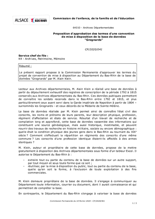 Le présent rapport propose à la Commission Permanente d'approuver les termes du projet de convention de mise à disposition au Département du Bas-Rhin de la base de données "Grognards" par M. Alain Klein.
